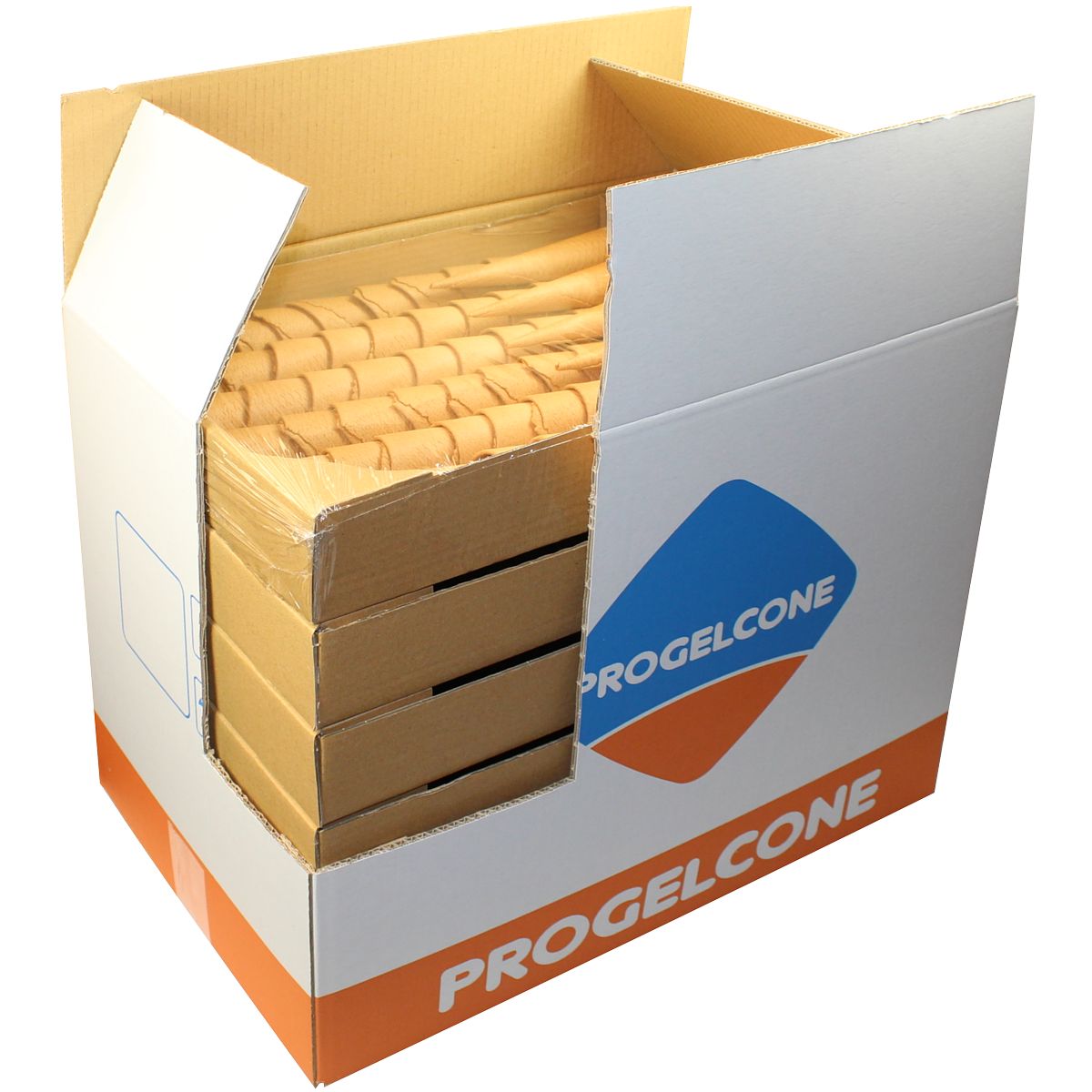 Esta forma de embalagem, desenvolvida pela Progelcone, permite que os cones se mantenham mais frescos, estaladiços e crocantes por mais tempo.