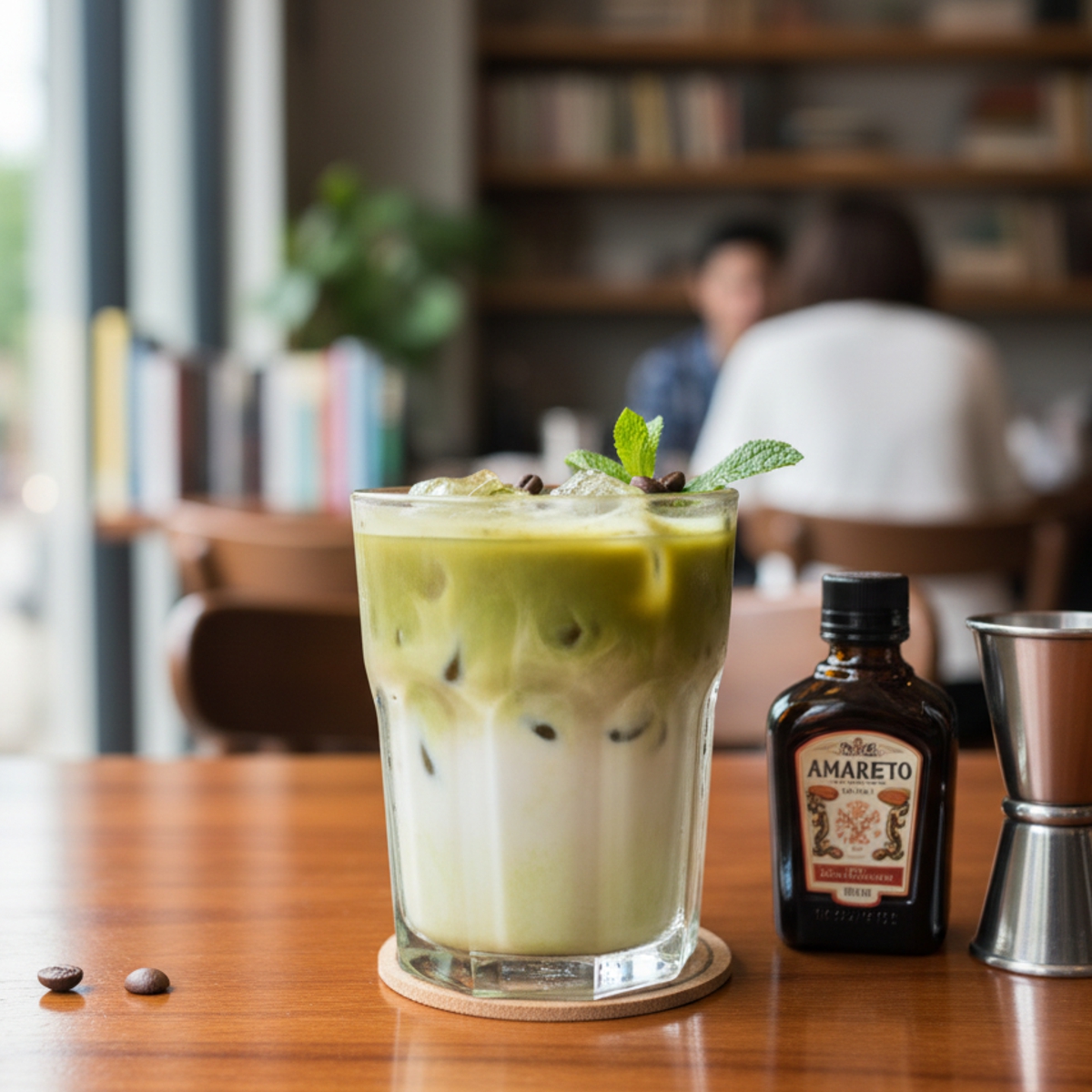 Completar com 30ml de café/matcha, vertendo devagar por cima do leite com o xarope, de modo a obter o efeito degradê