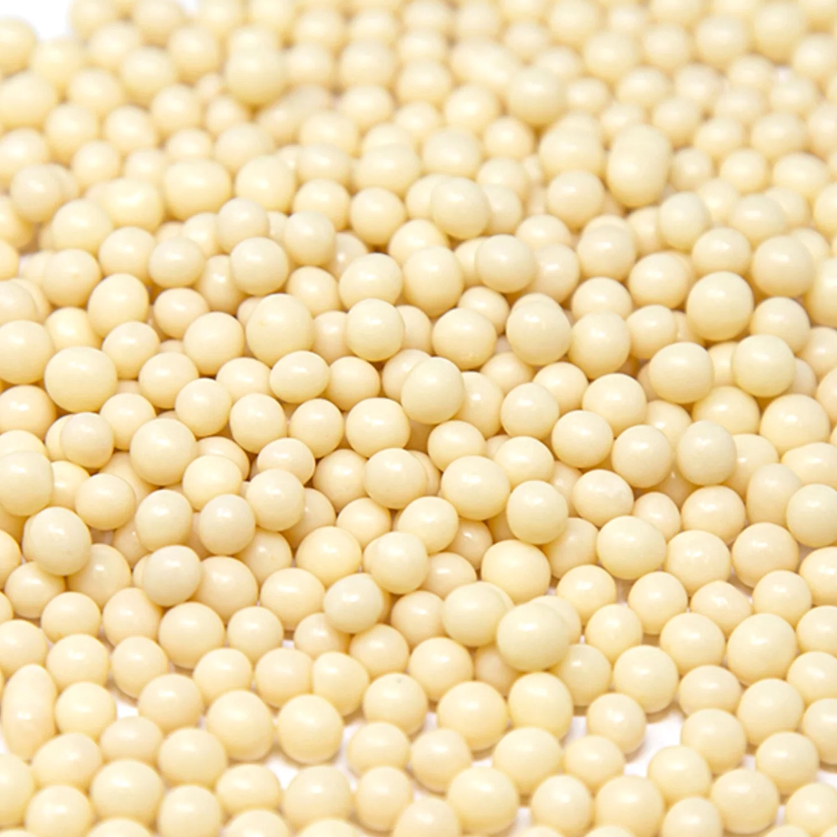 Pequenos pedaços de arroz tufado e trigo de 2-3 mm de diâmetro, cobertos com chocolate branco.