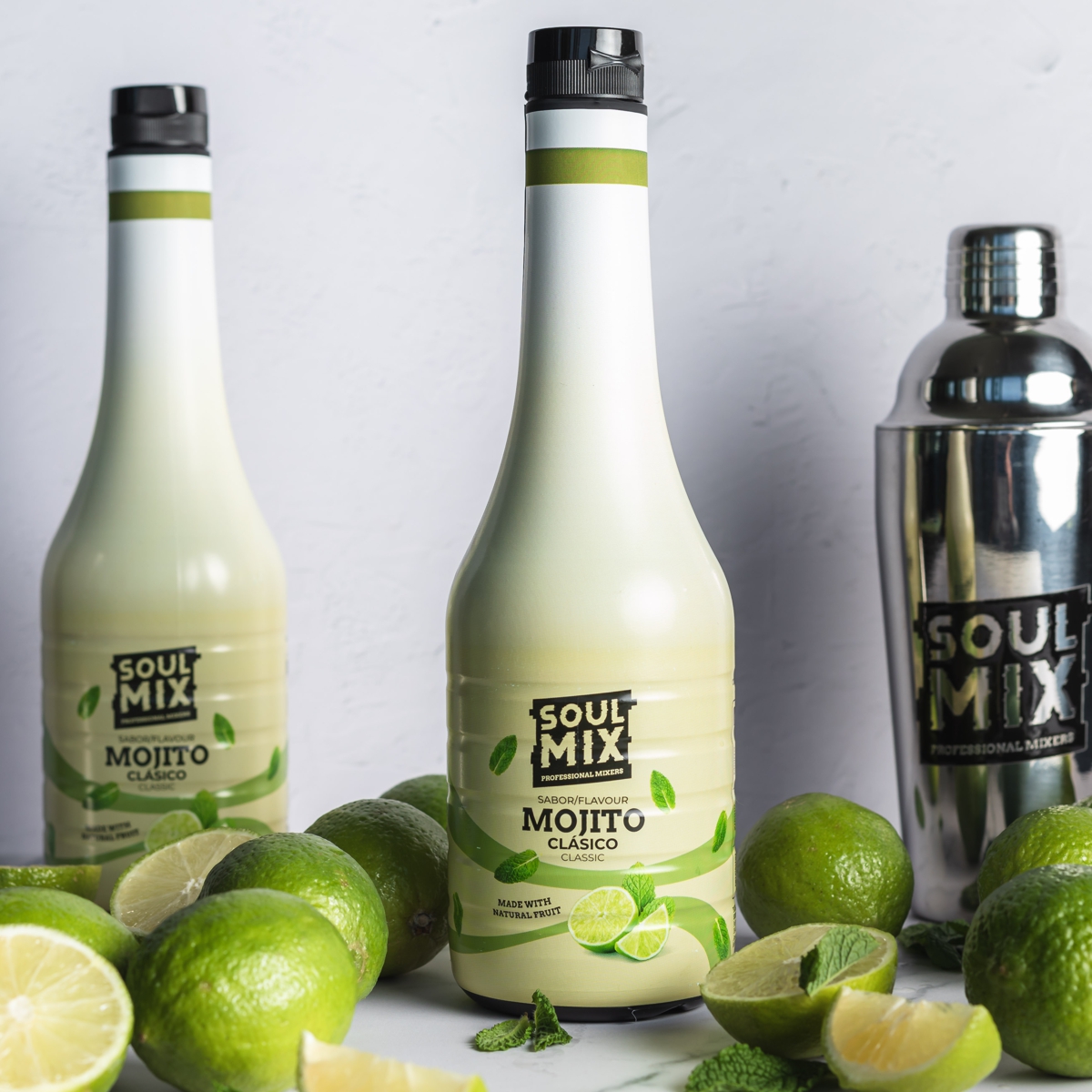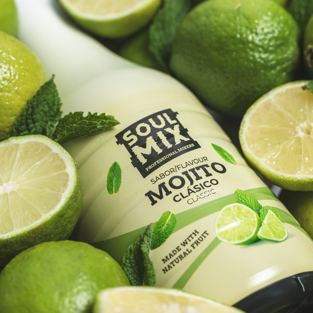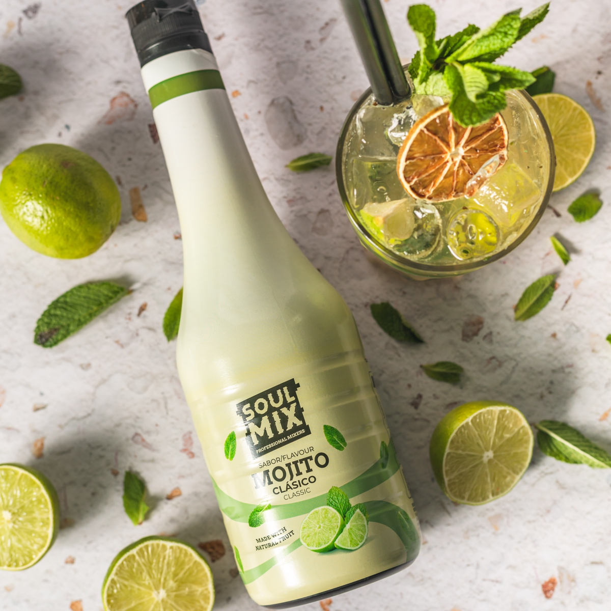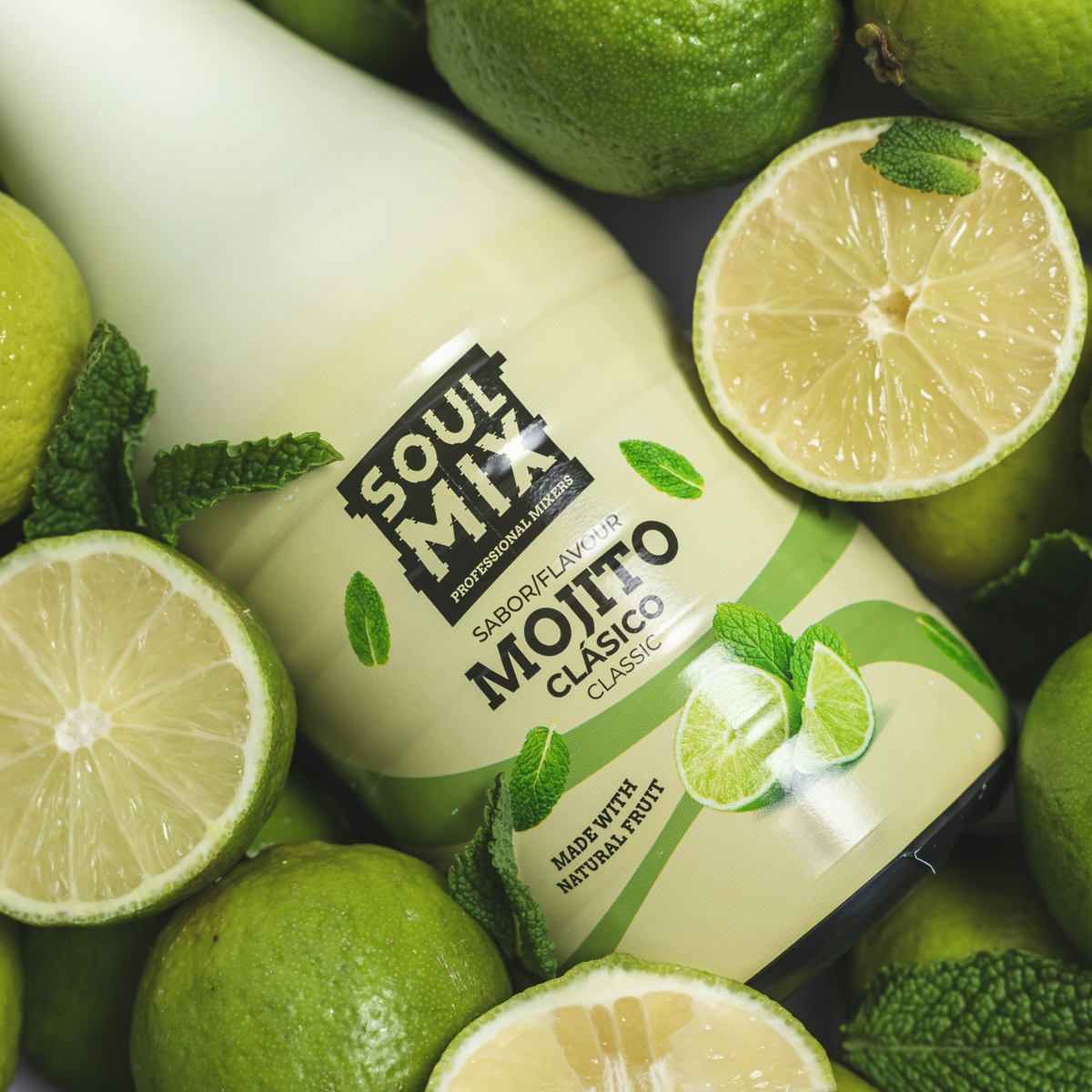 Desfrute do mojito tradicional com a nossa mistura natural de limas frescas, açúcar e hortelã.